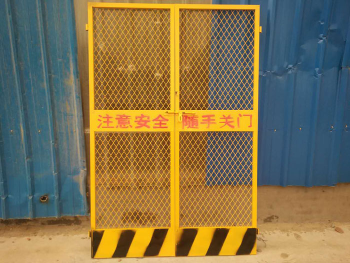 施工電梯防護(hù)門以焊接網(wǎng)片、擋板、方管為主要結(jié)構(gòu),網(wǎng)片網(wǎng)孔一般為50mm左右,絲徑一般在3.0mm以上,安全門方管尺寸一般為20*30mm或30*30mm尺寸,安全防護(hù)門擋板寬度、厚度按客戶要求定制;